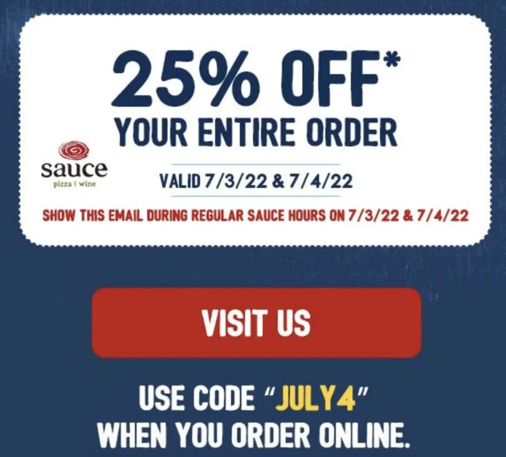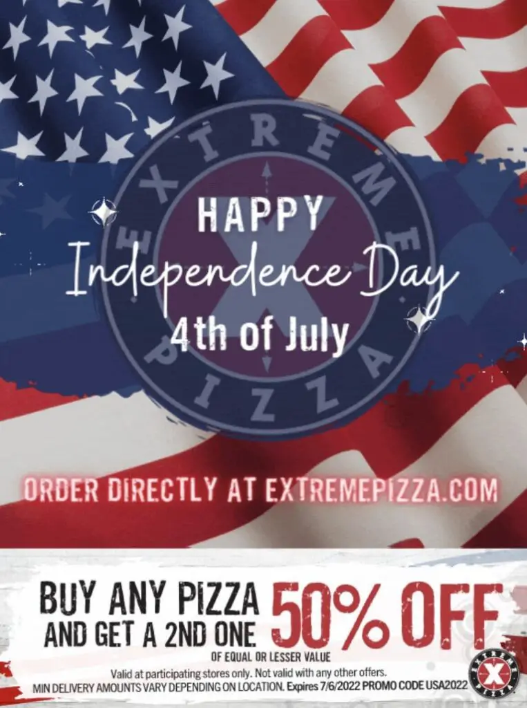 Check out these 4th of July food deals from Team Coupons.Pizza to add some cheesy goodness to your weekend BBQ, sun, fun, and fireworks plans. We’ve got you covered with some special deals on pizza like 1/4 off for the 4th, 25% off, $25 Meal Deal for 2, one-topping pizza for just $15.99 and more.