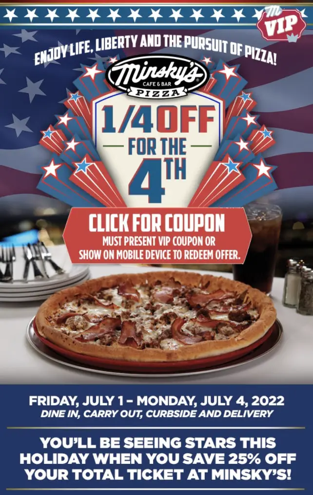 For online orders, simply use the coupon code FourthOff during checkout to enjoy this fantastic discount. If you prefer the ambiance of our cozy restaurant, you can still savor the savings! Just present your VIP coupon to your server, either printed or on your mobile device. Our special offer is valid for Dine-In, Carry Out, Curbside, and Delivery orders, ensuring you can celebrate in the way that suits you best. Don’t miss out on this limited-time offer exclusively at Minsky’s Pizza.
