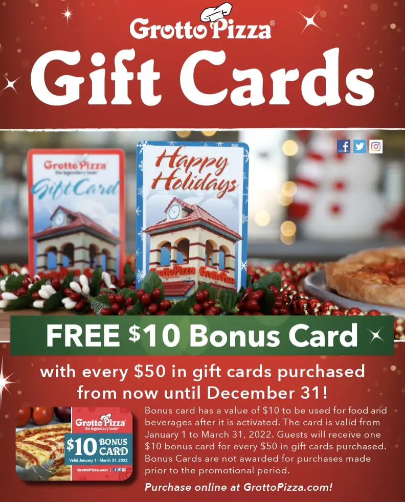 Attention pizza lovers! This Black Friday, purchase $50 in gift cards to Grotto Pizza and you’ll get a free bonus card worth an additional $10. You can redeem the offer both online at GrottoPizza.com or visit your local restaurant location now through December 31st, 2024 for more details about this special deal. With larger gifts comes bigger rewards: Get two bonus casino style cards when purchasing large single denominations ($500-$1000). So don’t hesitate—make sure to take advantage of this amazing promotion while it lasts!