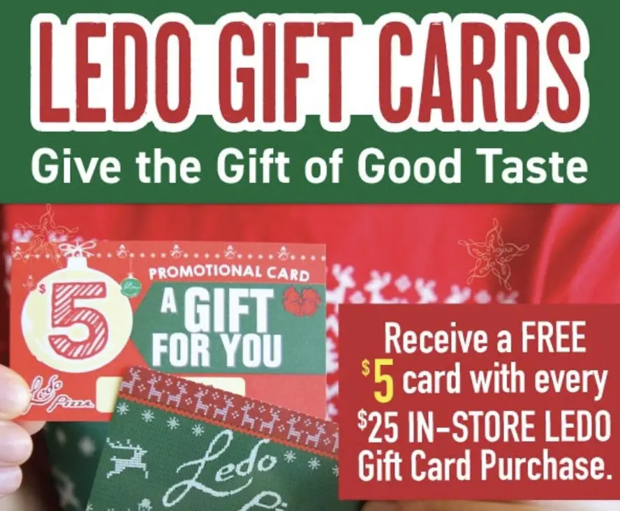This Black Friday, save big with Ledo Pizza‘s incredible deal – Get a Free $5 Card With Every $25 LEDO Gift Cards Purchase. Reward yourself or someone else and purchase gift cards for some delicious pizza. Whether you’re buying something special for the holidays or just wanting to take advantage of this opportunity before time runs out, there is no better time than now! Make sure to check it out on your next visit to get the best offered from one of our favorite restaurants.