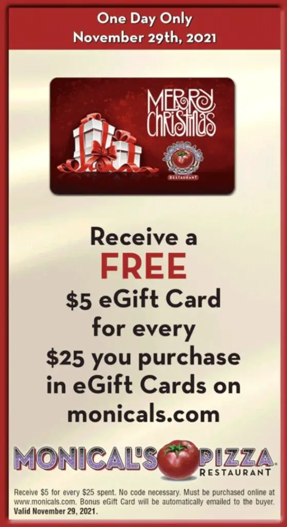 Buy $25 in Davanni’s Gift Cards, Get a Free $5 Gift Card!, this special deal is perfect for Black Friday at the pizza and hoagies restaurant. It allows you to get a free $5 gift card with every purchase of only $25 worth of Davanni’s gift cards. Enjoy delicious gourmet pizzas or hot Italian Hoagie case off your next visit when you grab this unique offer from an original favorite spot known as Davannis Pizza & Hot Hoagues.