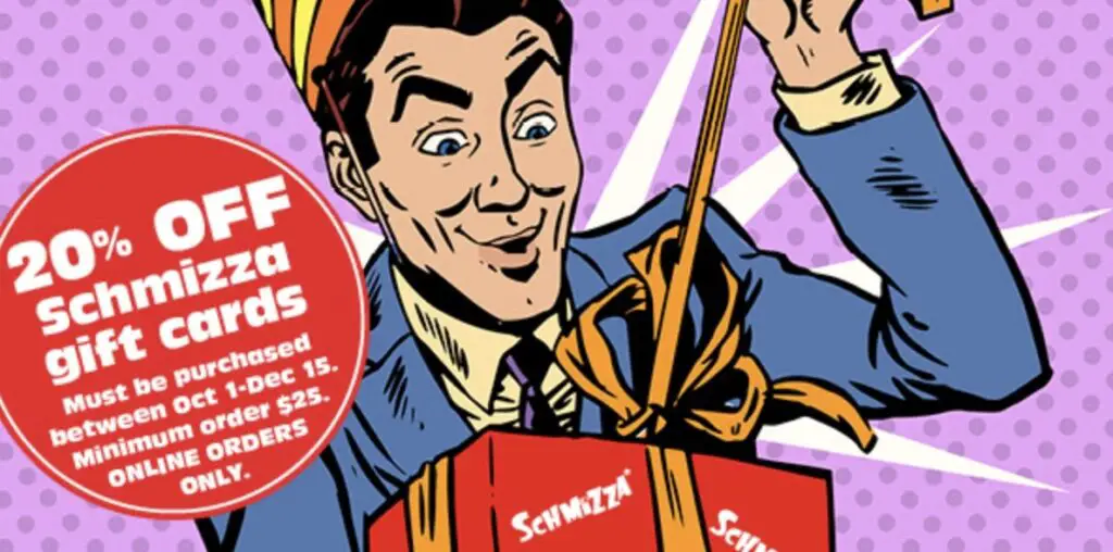 Visit Pizza Schmizza this Black Friday and take advantage of our limited-time offer: buy any gift card worth $25 or more online, and you’ll get 20% off! This special deal is valid for online purchase only – so don’t miss out on your chance to save big!