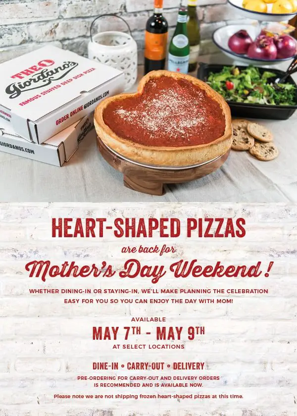 This Mother’s Day weekend, Giordano’s Pizza is offering a special deal where customers can order heart-shaped pizzas to celebrate mom in a unique and delicious way. Pre-ordering for delivery and carry-out is recommended to ensure you can enjoy this special treat on Mother’s Day. Giordano’s Pizza is known for its delicious deep-dish pizzas, making it the perfect place to indulge in a heart-shaped pie with mom. Don’t miss out on this heart-shaped pizza deal to show your appreciation for mom on her special day.