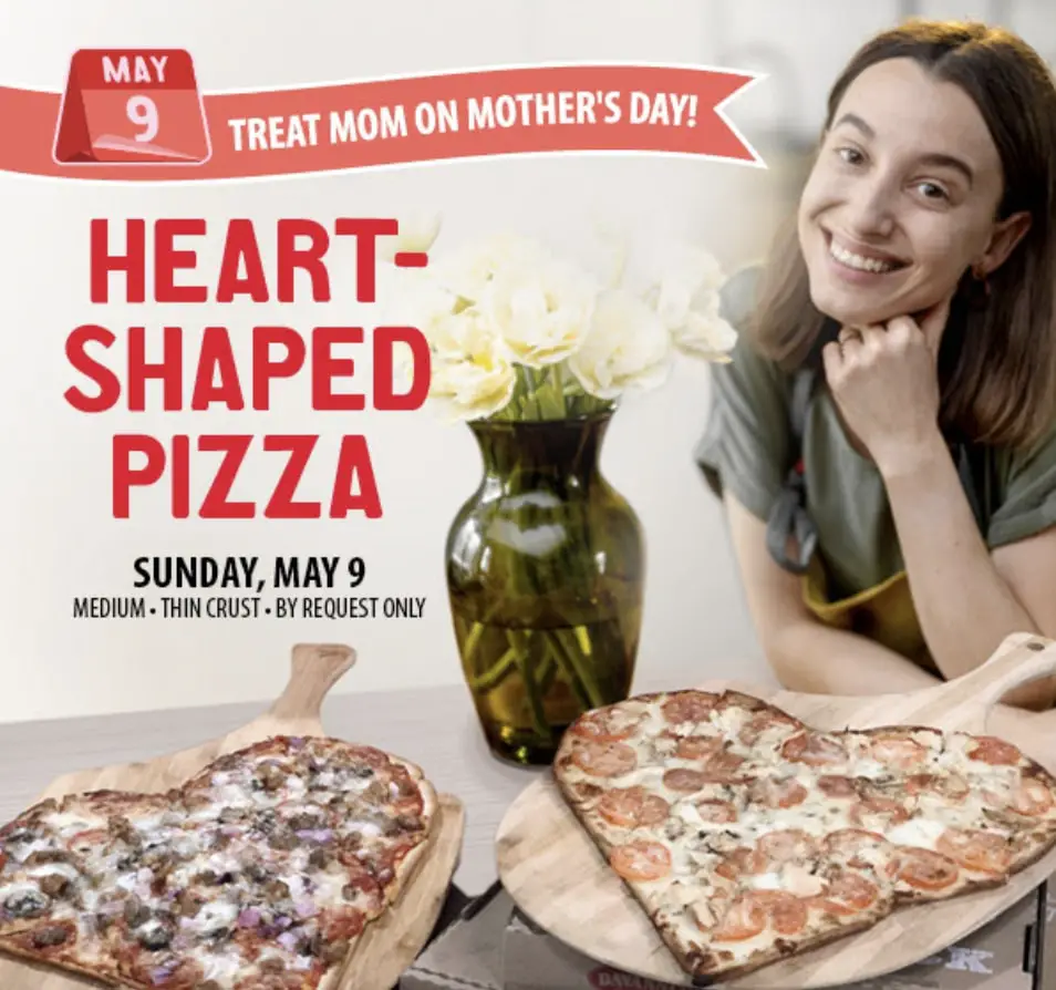 Mother’s Day is just around the corner on Sunday, May 11th, 2025, so why not combine our 2 favorite things on this special day – mom and pizza! We’re rounding up some of the best Mother’s day food deals, discounts, and specials at our favorite pizzerias. This includes our personal favorite, the heart shaped pizza (for mom!) along with other special offers like FREE pizza, 20% off deals, an extra pizza for mom for only $5, Treat Yourself bonus cards when you order a gift card for mom, $5 off orders of $30 or more, great deals on Mother’s Day Meal Packages for the whole family, and more.