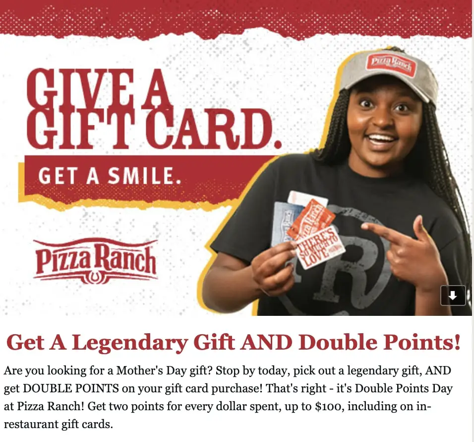 Buy $50 Gift Cards, Get a Free $10 Bonus Coupon: Are you looking for the perfect gift for Mom this Mother’s Day? Look no further than Pizza Ranch‘s limited time gift card offer. When you purchase $50 in Pizza Ranch gift cards in-restaurant, you’ll receive a $10 bonus coupon to use on a future purchase. Treat Mom to a delicious meal at Pizza Ranch and give her the gift of choice with this special deal. Don’t miss out on this opportunity to show your love and appreciation for Mom with a tasty gift that keeps on giving.