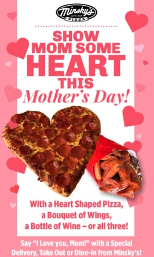 Celebrate Mother’s Day with a delicious treat from Minsky’s Pizza! For a limited time, you can enjoy a Medium Two-Topping or Gourmet Heart-Shaped Pizza for only $16.99. This special offer is available for Dine-in, Curbside, Delivery, and Online Ordering, making it convenient for you to enjoy a tasty meal with your loved ones. Simply call and mention this offer or use the coupon code online to redeem this Mother’s Day Special at Minsky’s Pizza. Treat your mom to a delightful pizza meal and show her your appreciation on this special day.
