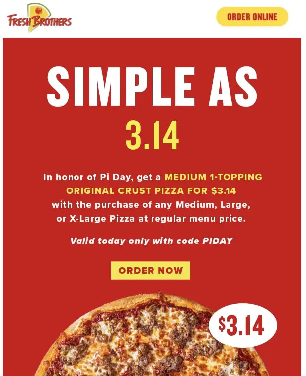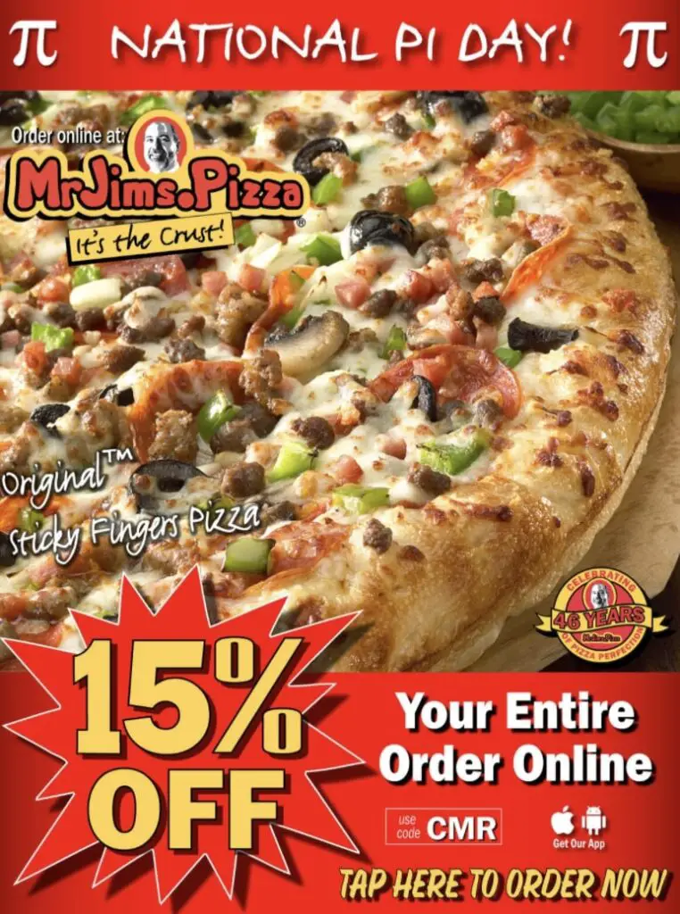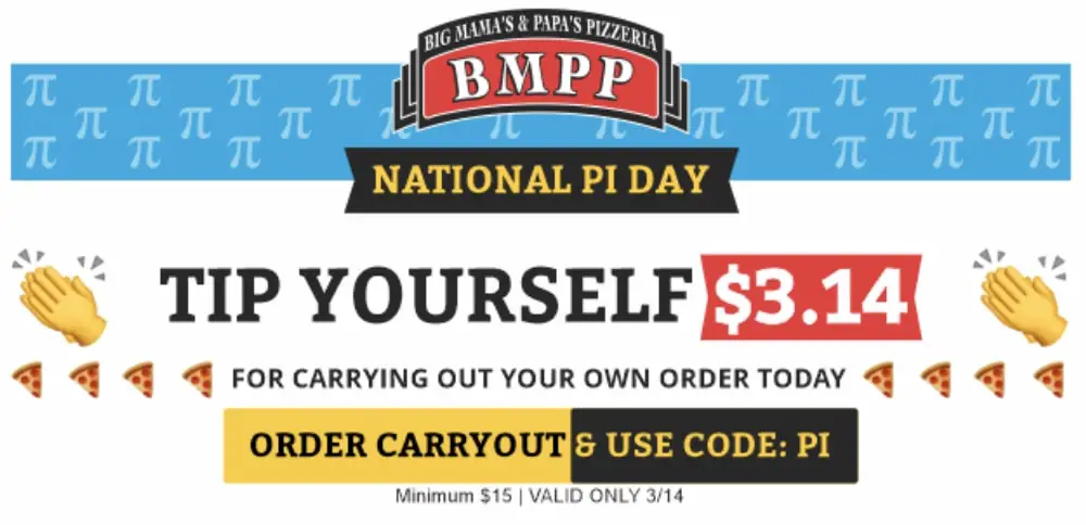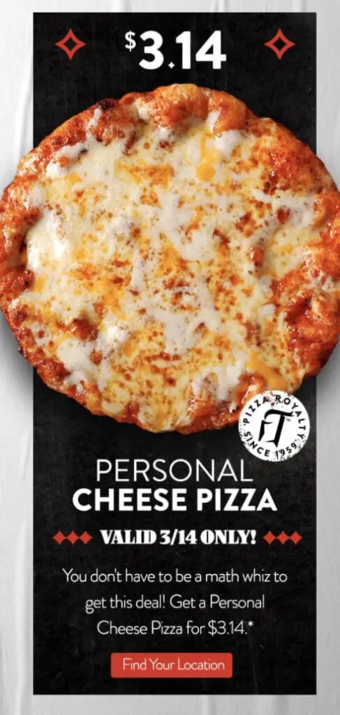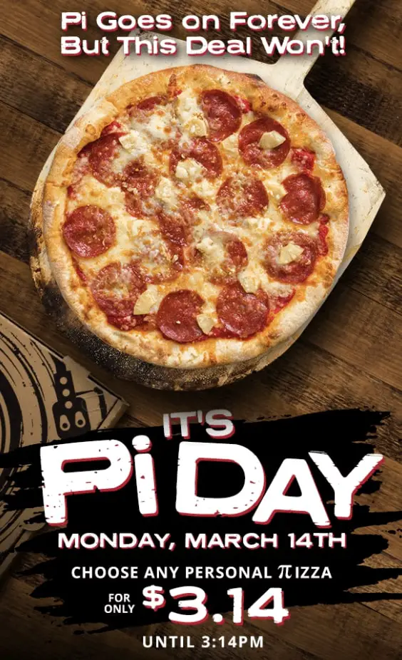 National Pi Day is on that special day (3.14) and pizza lovers know what that means…more amazing deals and discounts on our favorite pizza pi(e)s! Because we just need infinitely more reasons to eat a delicious cheesy pizza. So get ready to score these Pi Day deals, like pizzas for $3.14 and discounts of $3.14 or 3.14%.