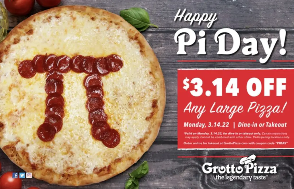 [Pi Day] Enjoy $3.14 off Any Large Pizza at Grotto Pizza! This amazing deal allows customers to buy any regular 12” pizza and get a second of equal or lesser value for only $3.14. This offer is valid for dine-in or takeout on Thursday, March 14, 2024 only. Customers can enjoy up to four $3.14 pizzas per person. It’s the perfect way to celebrate Pi Day with delicious pizza at a great price. Don’t miss out on this special deal from Grotto Pizza on Pi Day!