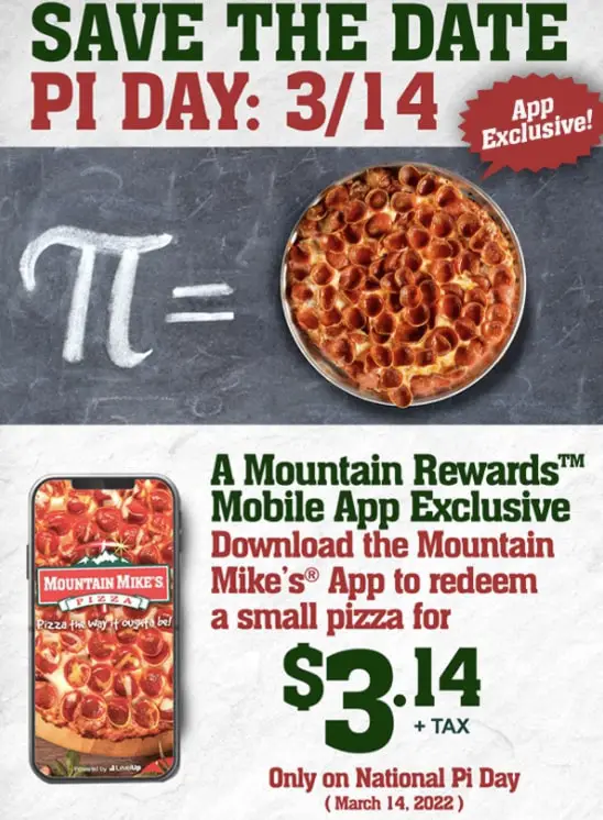 Unlock the $3.14 Pizza on Pi Day at 1000 Degrees Pizza! Celebrate Pi Day on March 14th by downloading the app and claiming this exciting deal. Enjoy the perfect pairing of delicious pizza and the mathematical constant 3.14 with this special promotion. Don’t miss out on this limited-time offer to indulge in a mouthwatering pizza for only $3.14. Make sure to mark your calendars and prepare your taste buds for a scrumptious treat on Pi Day.
