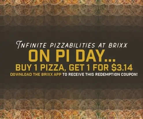 Pi Day BOGO: Buy Any 11-inch Pizza and Get the 2nd One for $3.14. Celebrate Pi Day in a delicious way with Pagliacci Pizza‘s special offer. Order an 11” pizza and get a second 11” pizza for just $3.14. Whether you prefer delivery, pick-up, or dining in, you can take advantage of this amazing deal on March 14, 2024. Happy Pi Day to all the pizza lovers out there!