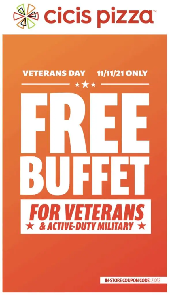 This Veteran’s Day, active-duty military and veterans can enjoy a free buffet meal at Cici’s Pizza locations! Simply present your valid Military ID along with this coupon to take advantage of the special deal. Celebrate Veteran’s Day in style by indulging in all your favorite pizza toppings and more, for absolutely no cost. Whether you’re stationed nearby or venturing out from afar, be sure to stop into any local Cici’s on November 11th so that you don’t miss out on this incredible offer!
