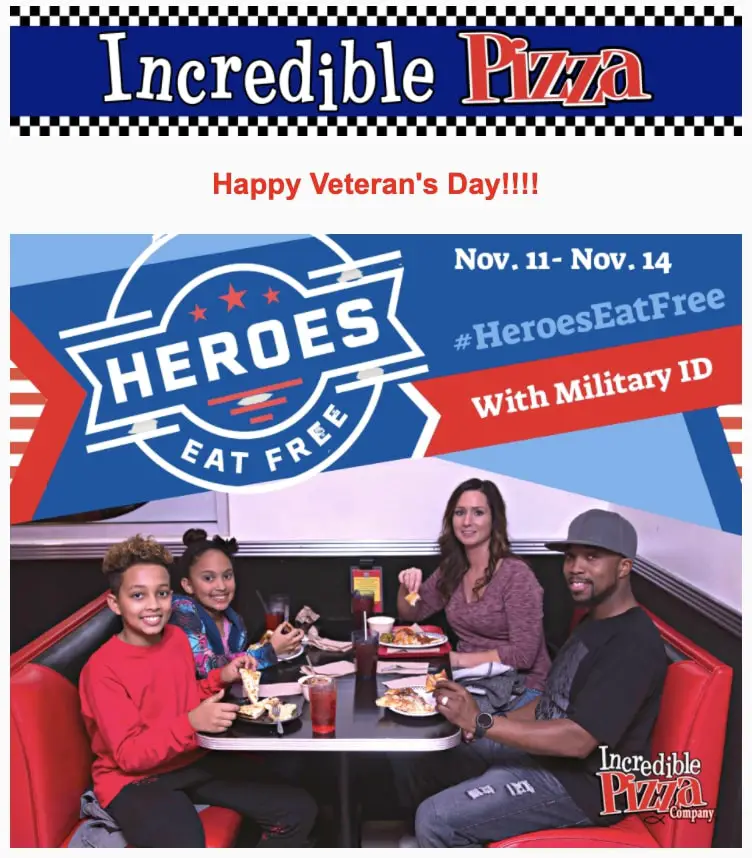 ![Incredible Pizza Veterans Day [Veterans Day Special] Military EAT FREE with Military ID](https://coupons.pizza/print-coupon/incrediblepizza.com/incrediblepizza.com-printable-coupon-1699098067.jpg)