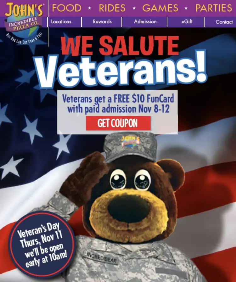 ![John's Incredible Pizza Veterans Day [Veteran's Day] Free $10 FunCard for Veterans & Active Duty Military](https://coupons.pizza/blog/wp-content/uploads/2023/11/veteran-s-day-free-10-funcard-for-veterans-active-duty-military-john-s-incredible-pizza-deal-1699359905.jpg)