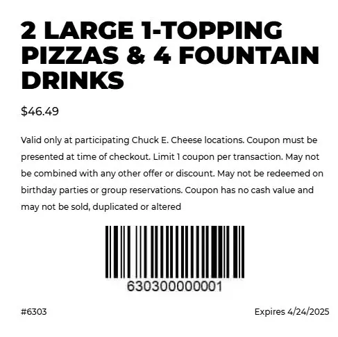 Valid only at participating Chuck E. Cheese locations. Coupon must be presented at time of checkout. Limit 1 coupon per transaction.