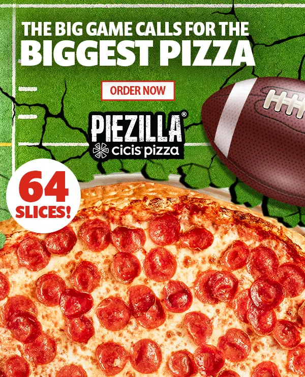 Get Big Game Ready with Piezilla! The 28-inch behemoth of a pizza. Feed around 15 people with 64 slices ready to wreck your hunger.