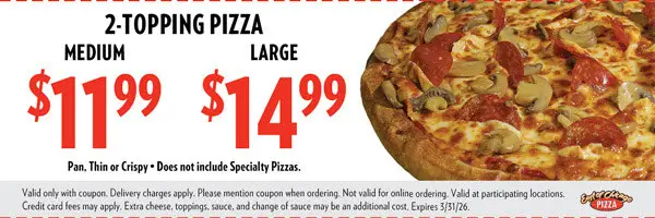 Get Medium 2-Topping Pizza for $11.99 OR Large 3-Topping Pizza for $14.99