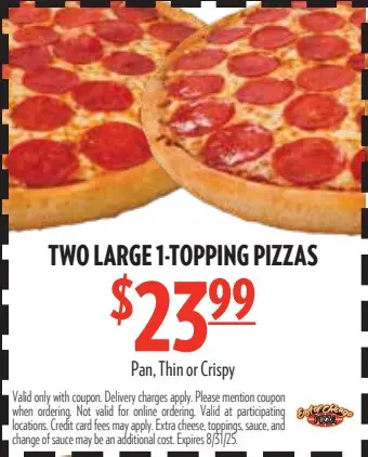 Celebrate National Pizza Day 2025 with our large 1-Topping Pizzas!!! Valid at participating locations. Use coupon to redeem offer.
