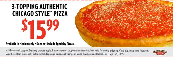 Get 3-Topping Authentic Chicago Style Medium Pizza for $15.99