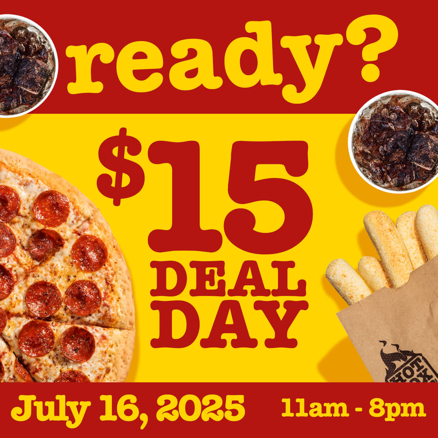 Score a LG Pepperoni or Cheese Pizza, Stix + a Dip, and two Drinks for just $15! Valid for Delivery, Carry-out, or Dine-in at all HotBox locations. No Coupon is Needed!