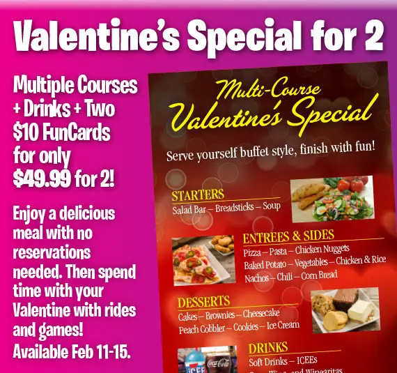 Enjoy $49.99 Valentine's Special for 2: Includes admission, buffet, drinks, and a $10 FunCard for two people. Offer valid 2/11/26-2/15/26. Coupon may only be redeemed when paying for admission.