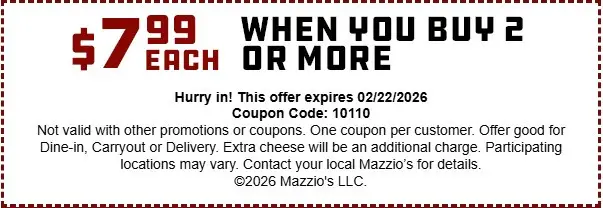 Mix and Match Offer At Mazzio's. Choose From Pizza, Stromboli, Wings, Dippers and Desserts. One coupon per customer. Offer good for Dine-in, Carryout or Delivery.