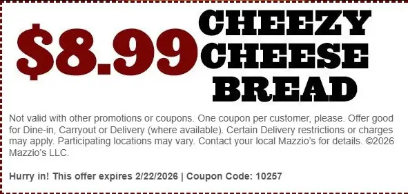 One coupon per customer, please. Offer good for Dine-in, Carryout or Delivery (where available).