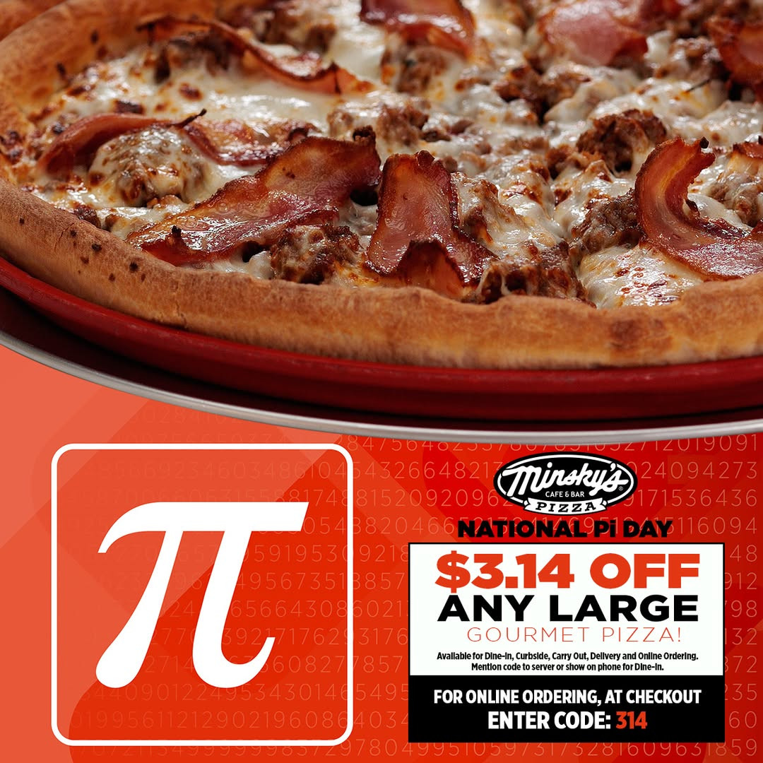 Minsky’s is celebrating #PiDay for 3.14 days! Minsky's is honoring everyone’s favorite mathematical constant with $3.14 off Large Gourmet Pizzas from Minsky’s from March 12 through March 15 for National Pi Day! Mention this to your server or online use the promo code "314".