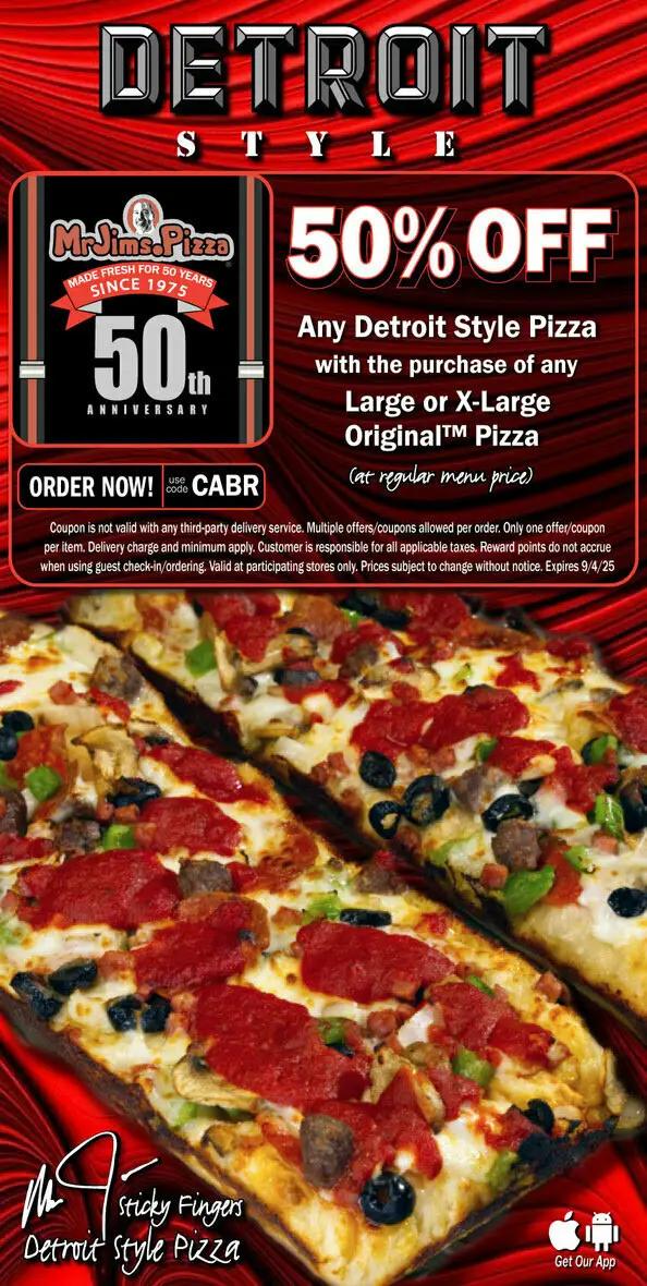 Buy any Large or X-Large Original™ Pizza and enjoy any Detroit-style pizza for 50% less! Use printable coupon or coupon code below to redeem offer.