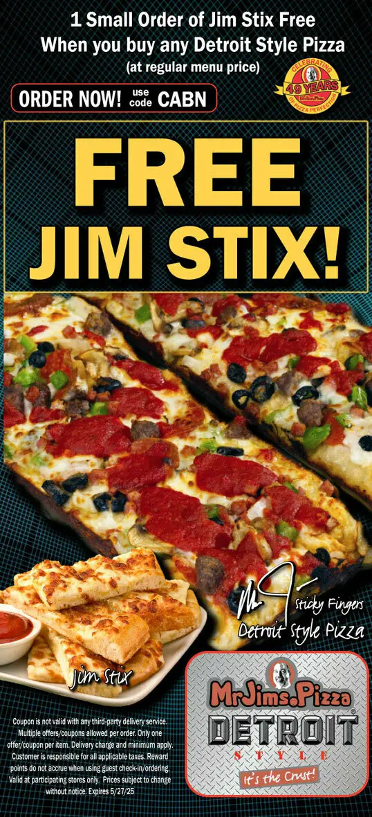 1 Small Order Of Jim Stix FREE when you buy any Detroit Style Pizza at regular menu price Use online code when ordering.