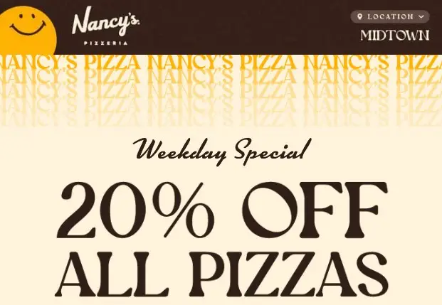 Every week, Monday-Thursday, dine with us to get 20% OFF ALL PIZZAS! Offer valid for dine-in only on specified days of the week at Nancy’s Pizza Midtown thru 5/31/25.