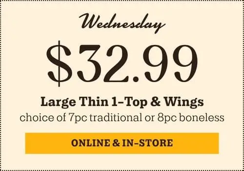 Wednesday Special: Get Large Thin 1-Topping & Wings for $32.99