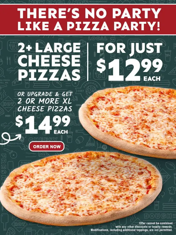 Upgrade to 2+ Extra Large Cheese Pizzas - $14.99 Each. Cannot be combined with any other offer or discount.