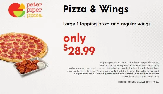 Check this Deal online. Valid at participating Peter Piper Pizza restaurants only. Limit one coupon per customer per visit.