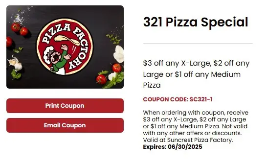 Use coupon code or printable coupon to apply discount. Valid at Suncrest Pizza Factory.