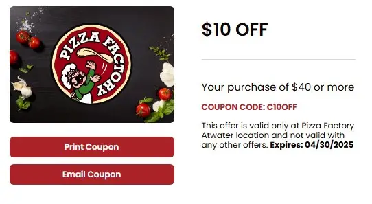 Get $10 Off your purchase of $40 or more. Valid only at Pizza Factory Atwater location.