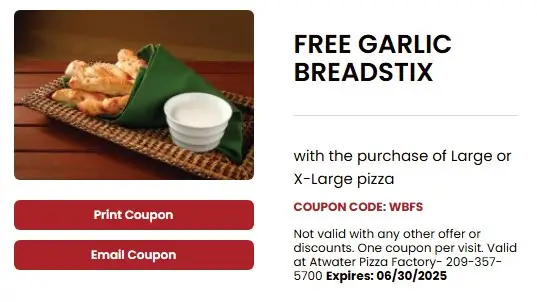 Get Free Garlic Breadstix with the purchase of Large or X-Large pizza. Valid at Atwater Pizza Factory.