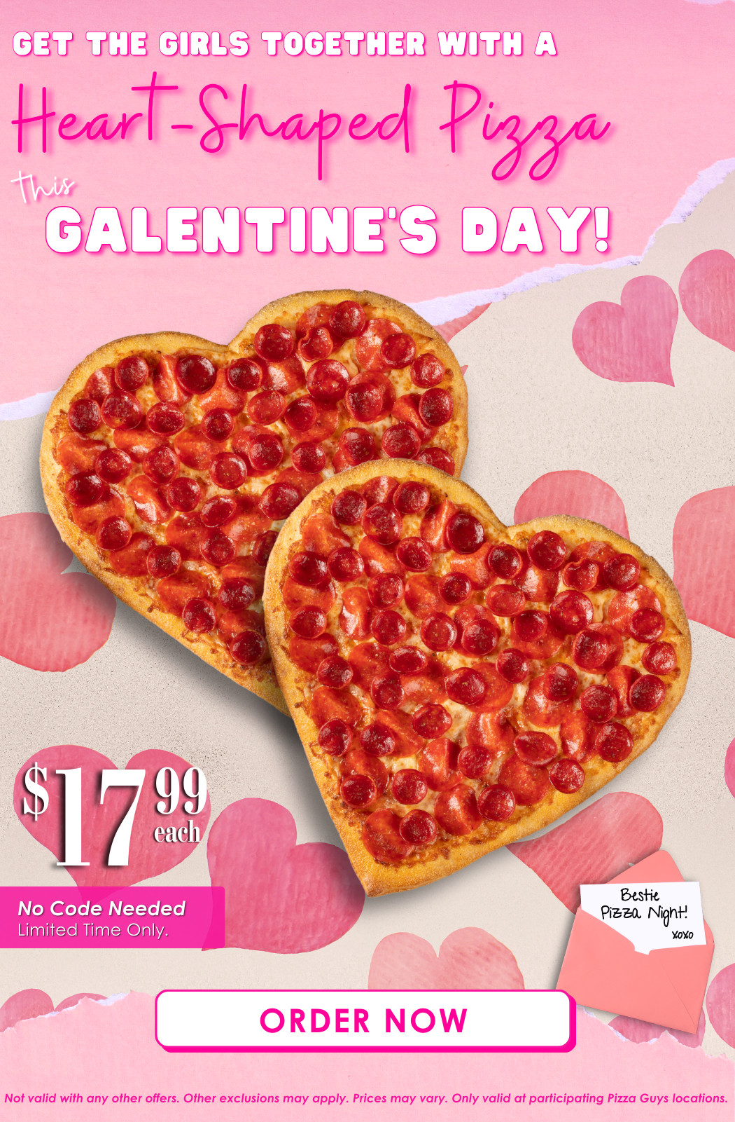 Get Ready for Galentine’s Day! Enjoy our Large 1-topping, Heart-Shaped Pizza for $17.99. Pricing and availability may vary by location.