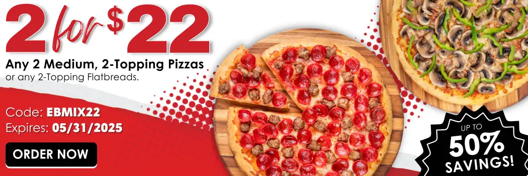 Any 2 Medium 2 Topping Pizzas or 2 Topping Flatbreads for $22