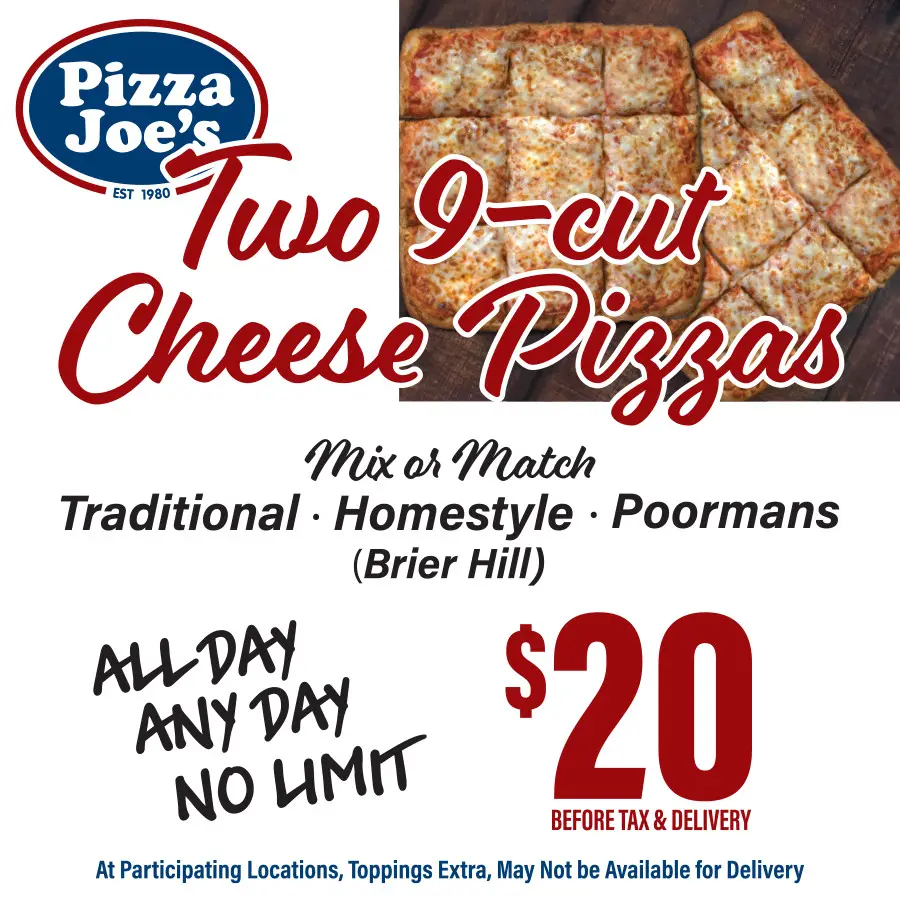 Enjoy two 9-Cut Cheese Pizzas for Just $20. This offer is limited time offer. Pricing may vary by locations.