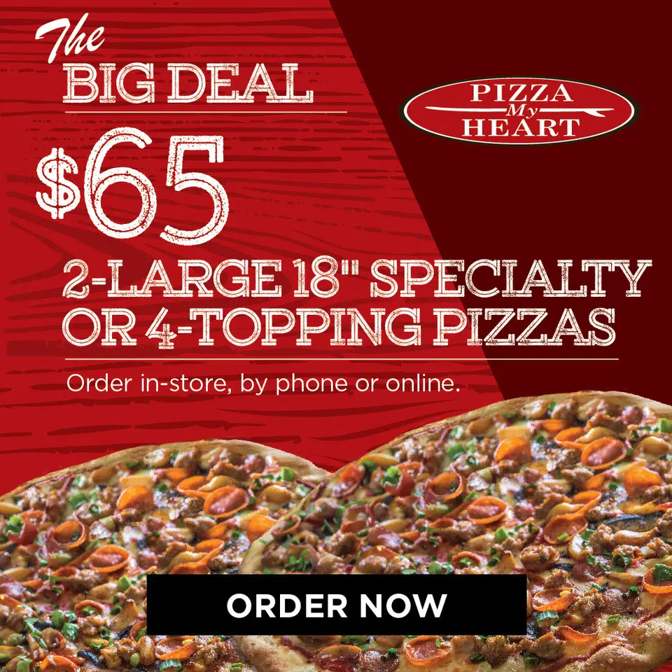 Get any two of our huge 18" large specialty or 4 topping pizzas for just $65. Order in store, by phone or online.
