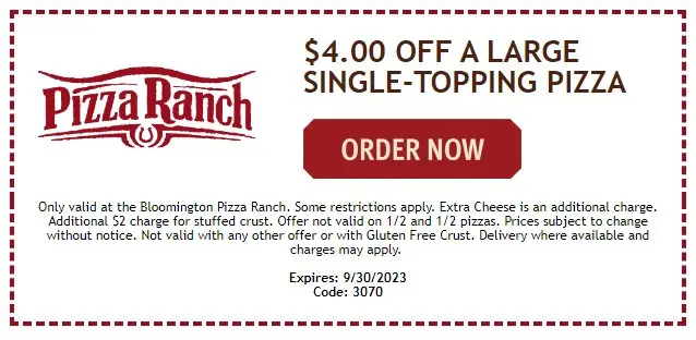Use the coupon below to get $4 off a large single-topping pizza through the end of September! Only valid at the Bloomington Pizza Ranch. Check your local Pizza Ranch if they participate in this promo.