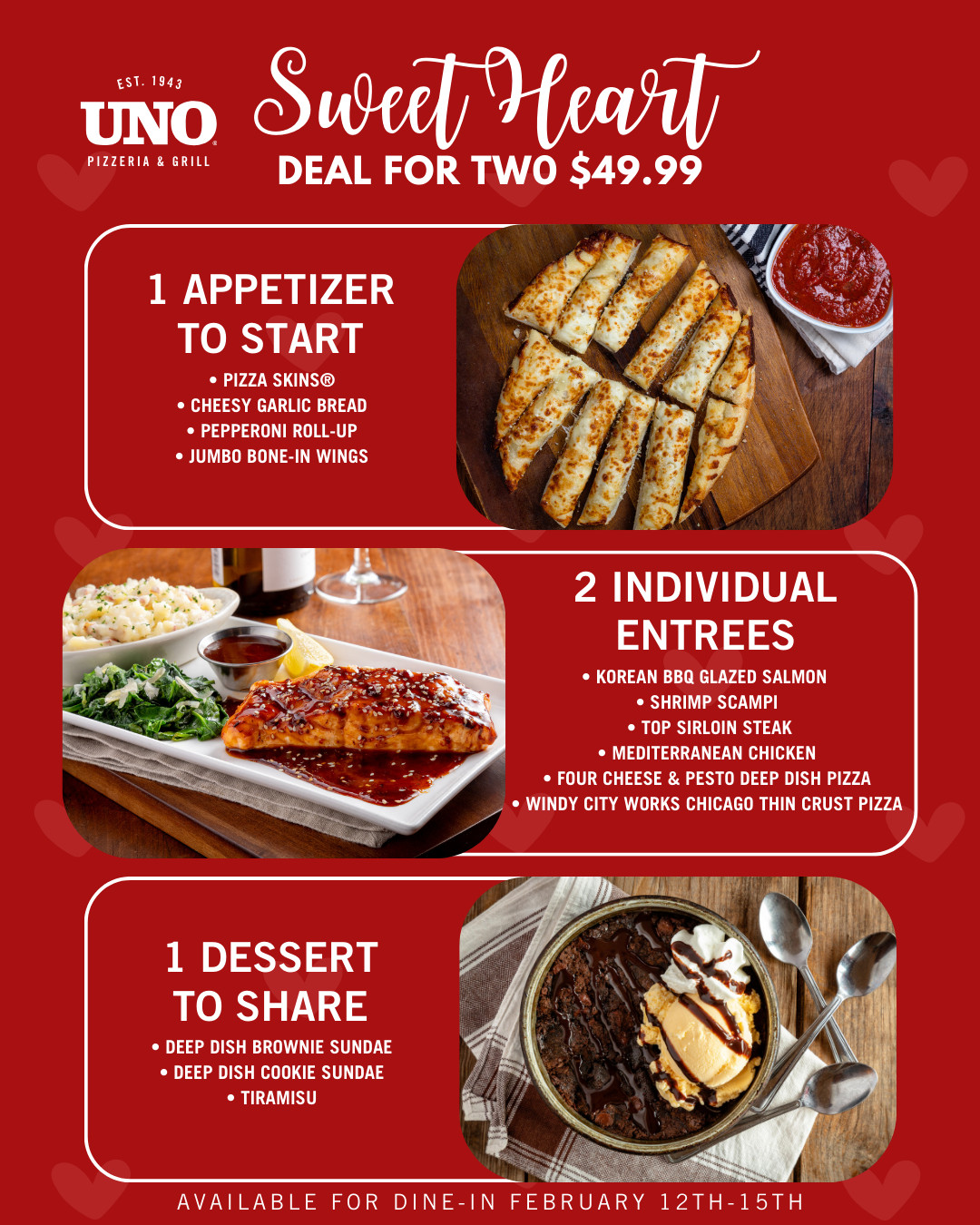 Choose 2 entrees, an appetizer and a dessert to share from our Valentine’s Day menu for just $49.99. Available for dine-in on February 12th-15th. Participating locations may vary.