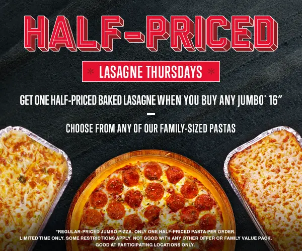 Half-Priced Pasta Thursdays: 1 Half-Priced Family Sized Pasta with Purchase of Any Jumbo 16-inch